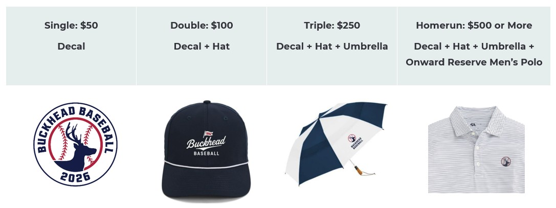 - HOMERUN: $500+ (decal + hat + Buckhead Baseball-branded umbrella, Onward Reserve Buckhead Baseball-branded men’s polo) *Homerun level donors will receive a link to select their men’s polo size*